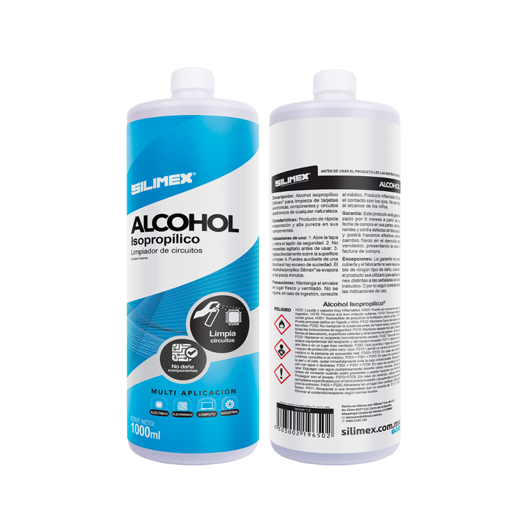 El Alcohol Isopropílico de SILIMEX (1 Litro) es el solvente de alta pureza esencial para el mantenimiento y la limpieza de tarjetas, componentes y circuitos electrónicos de cualquier tipo. Su fórmula de grado técnico garantiza la eliminación segura de residuos, grasa y suciedad, siendo indispensable en talleres, laboratorios y para usuarios avanzados.