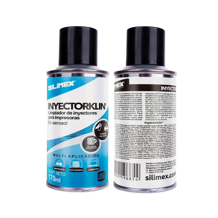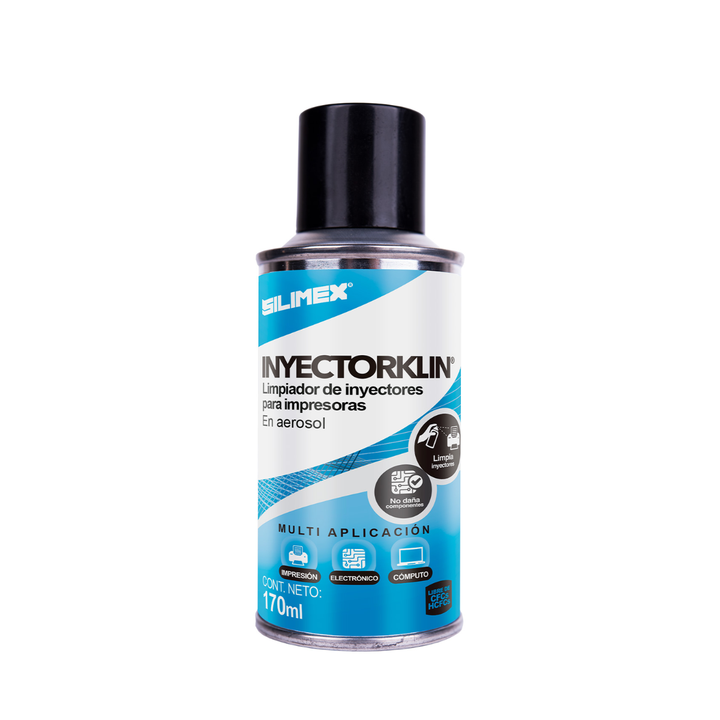 Inyectorklin de SILIMEX es un limpiador especializado en aerosol de 170 ml diseñado específicamente para el mantenimiento y desobstrucción de cabezales de impresoras de inyección de tinta. Su fórmula potente disuelve la tinta seca y los residuos acumulados, restaurando la funcionalidad del cabezal y asegurando una calidad de impresión nítida y profesional.
