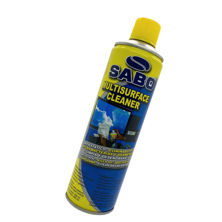 El MULTISURFACE CLEANER SABO (590 ml) es una espuma limpiadora de uso externo con acción desinfectante de alta eficacia. Está formulada para eliminar el 99.99% de virus y bacterias, a la vez que remueve manchas superficiales y deja una capa antiestática que repele el polvo.